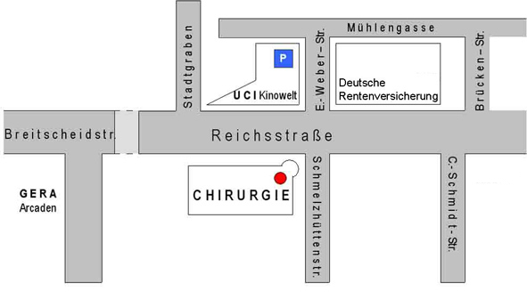 Die Chirurgische Gemeinschaftspraxis befindet sich im Zentrum Gera´s in der Schmelzhüttenstraße/Ecke Reichsstraße gegenüber der UCI-Kinowelt und der Deutschen Rentenversicherung.